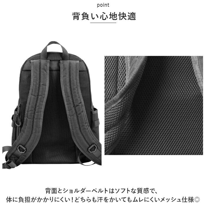 ・背面とショルダーベルトはソフトな質感で、体に負担がかかりにくい!どちらも汗をかいてもムレにくいメッシュ仕様◎