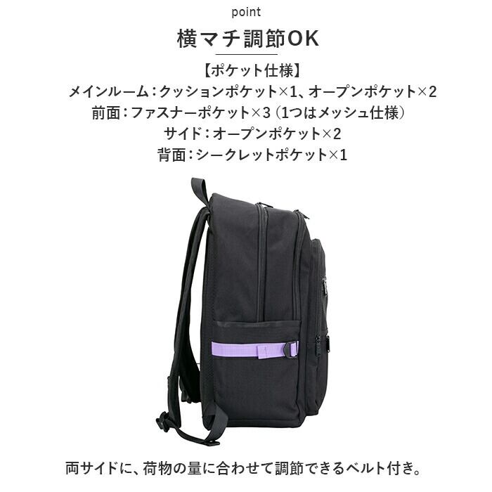 ・B4サイズが縦向きにぴったり。通学に必要なテキストなどはもちろん、ノートPCを収納できるクッションポケットや小物ポケットも搭載!