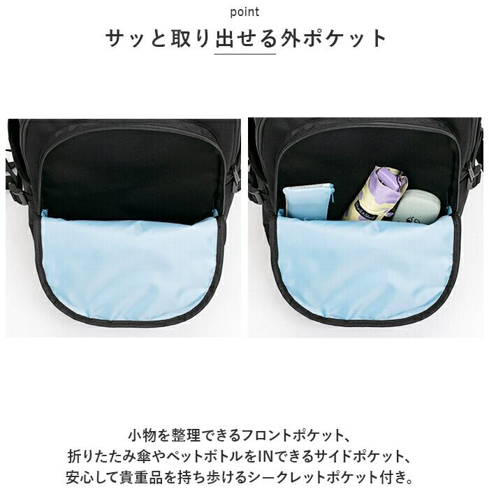 ・小物を整理できるフロントポケット、折りたたみ傘やペットボトルをINできるサイドポケット、安心して貴重品を持ち歩けるシークレットポケット付き。