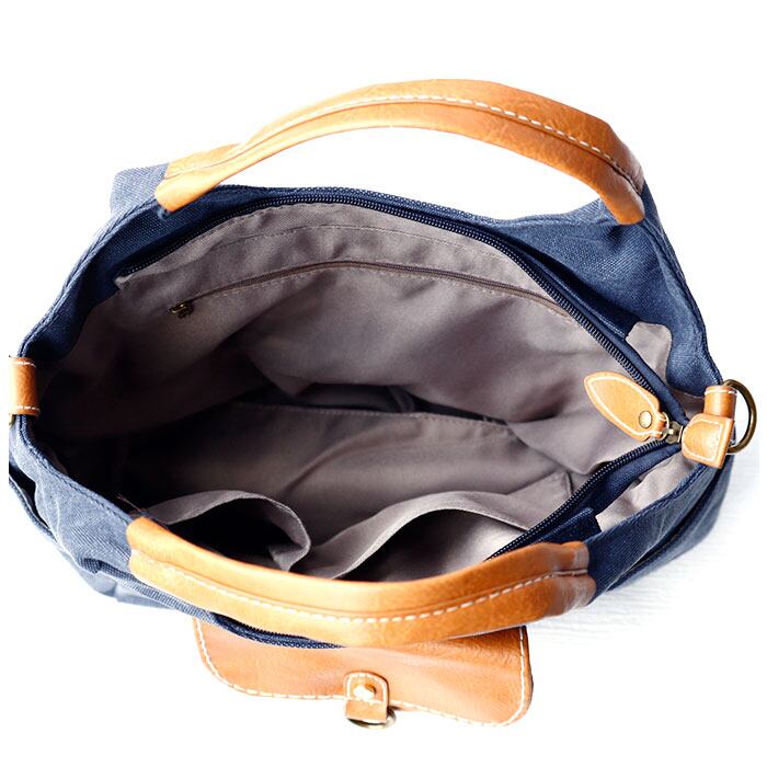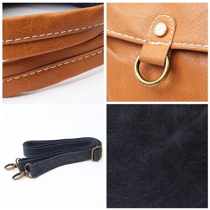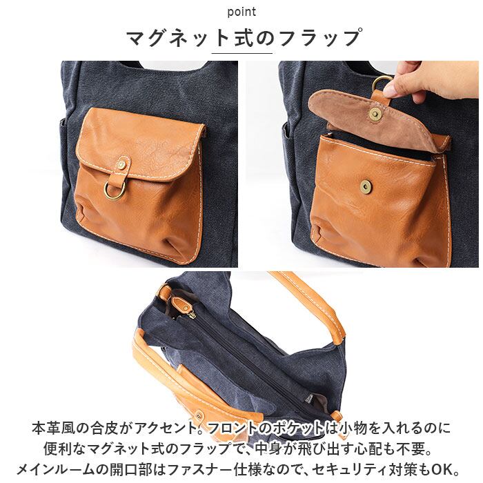 ・本革風の合皮がアクセント。フロントのポケットは小物を入れるのに便利なマグネット式のフラップで、中身が飛び出す心配も不要。メインルームの開口部はファスナー仕様なので、セキュリティ対策もOK。