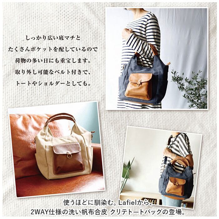 ・使うほどに馴染む。Lafielから、2WAY仕様の洗い帆布合皮 クリテトートバッグの登場。