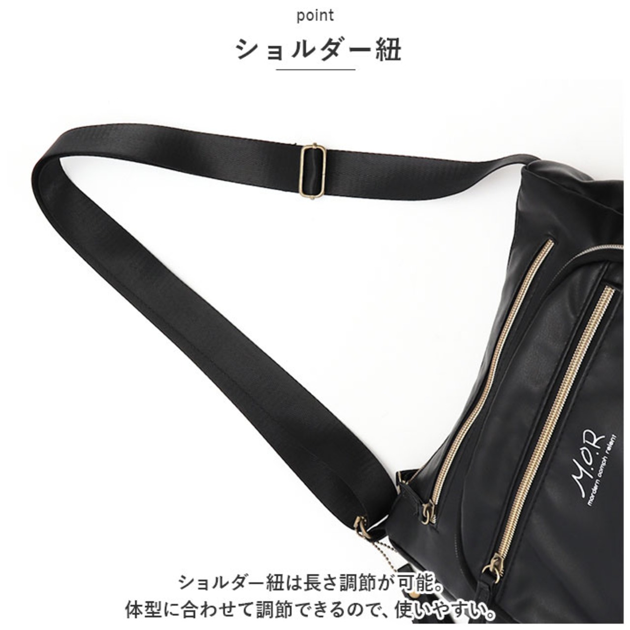 ・ショルダー紐は長さ調節が可能。体型に合わせて調節できるので、使いやすい。