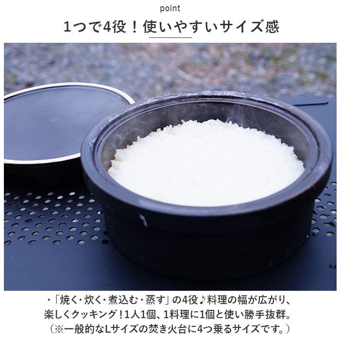 ・「焼く・炊く・煮込む・蒸す」の4役♪料理の幅が広がり、楽しくクッキング!1人1個、1料理に1個と使い勝手抜群。(※一般的なLサイズの焚き火台に4つ乗るサイズです。)