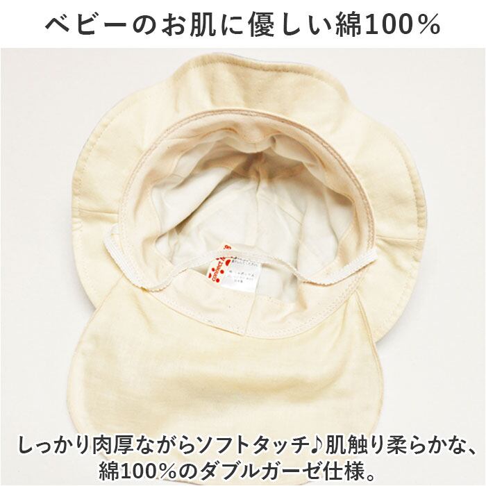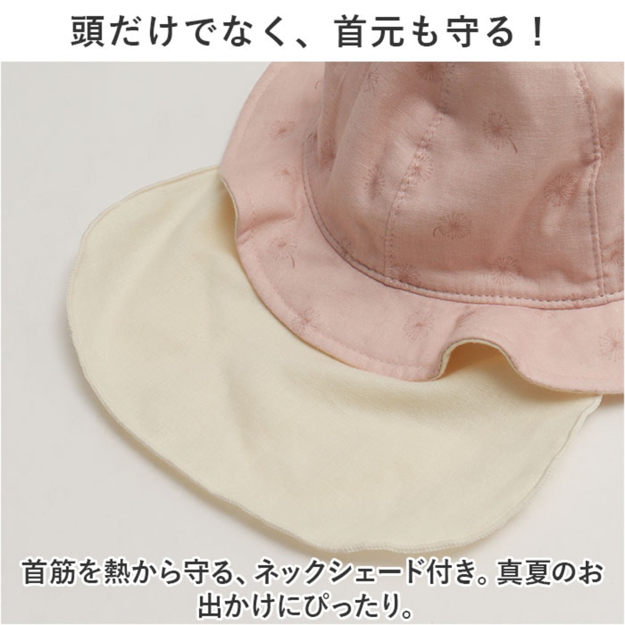 ・首筋を熱から守る、ネックシェード付き。真夏のお出かけにぴったり。