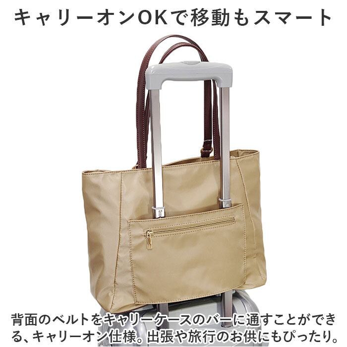 ・背面のベルトをキャリーケースのバーに通すことができる、キャリーオン仕様。出張や旅行のお供にもぴったり。