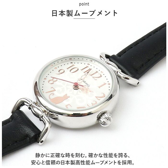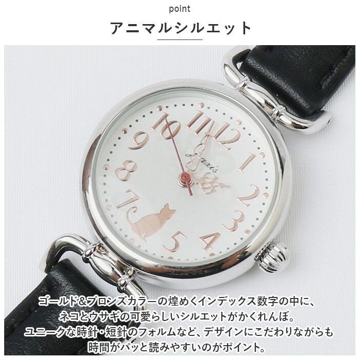 ・ゴールド&ブロンズカラーの煌めくインデックス数字の中に、ネコとウサギの可愛らしいシルエットがかくれんぼ。ユニークな時針・短針のフォルムなど、デザインにこだわりながらも時間がパッと読みやすいのがポイント。