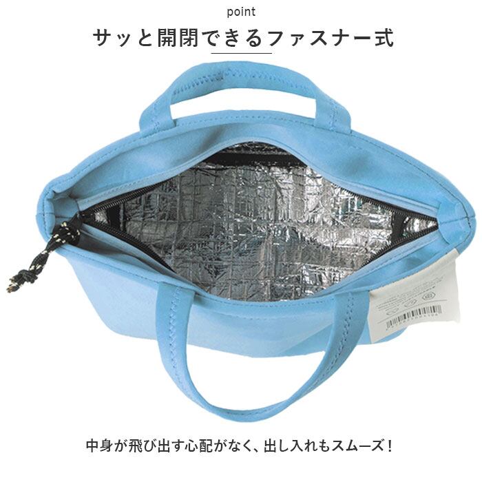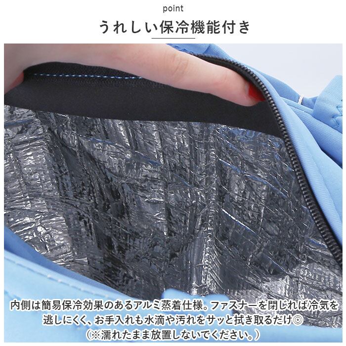 ・内側は簡易保冷効果のあるアルミ蒸着仕様。ファスナーを閉じれば冷気を逃しにくく、お手入れも水滴や汚れをサッと拭き取るだけ◎(※濡れたまま放置しないでください。)