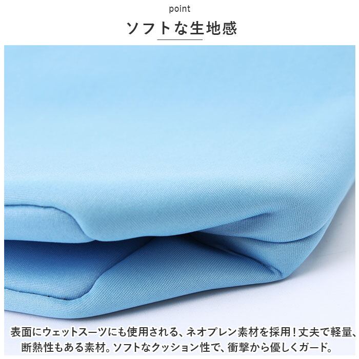 ・表面にウェットスーツにも使用される、ネオプレン素材を採用!丈夫で軽量、断熱性もある素材。ソフトなクッション性で、衝撃から優しくガード。