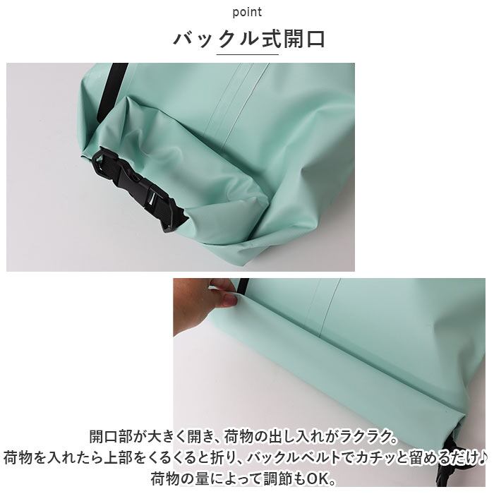 ・開口部が大きく開き、荷物の出し入れがラクラク。荷物を入れたら上部をくるくると折り、バックルベルトでカチッと留めるだけ♪荷物の量によって調節もOK。