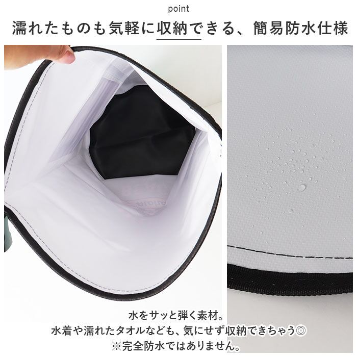 ・水をサッと弾く素材。水着や濡れたタオルなども、気にせず収納できちゃう◎(※完全防水ではありません。)