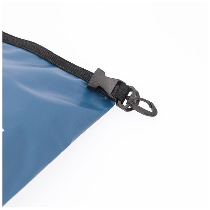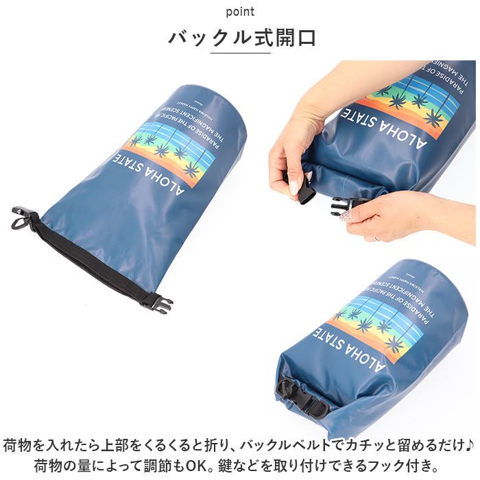 ・荷物を入れたら上部をくるくると折り、バックルベルトでカチッと留めるだけ♪荷物の量によって調節もOK。鍵などを取り付けできるフック付き。