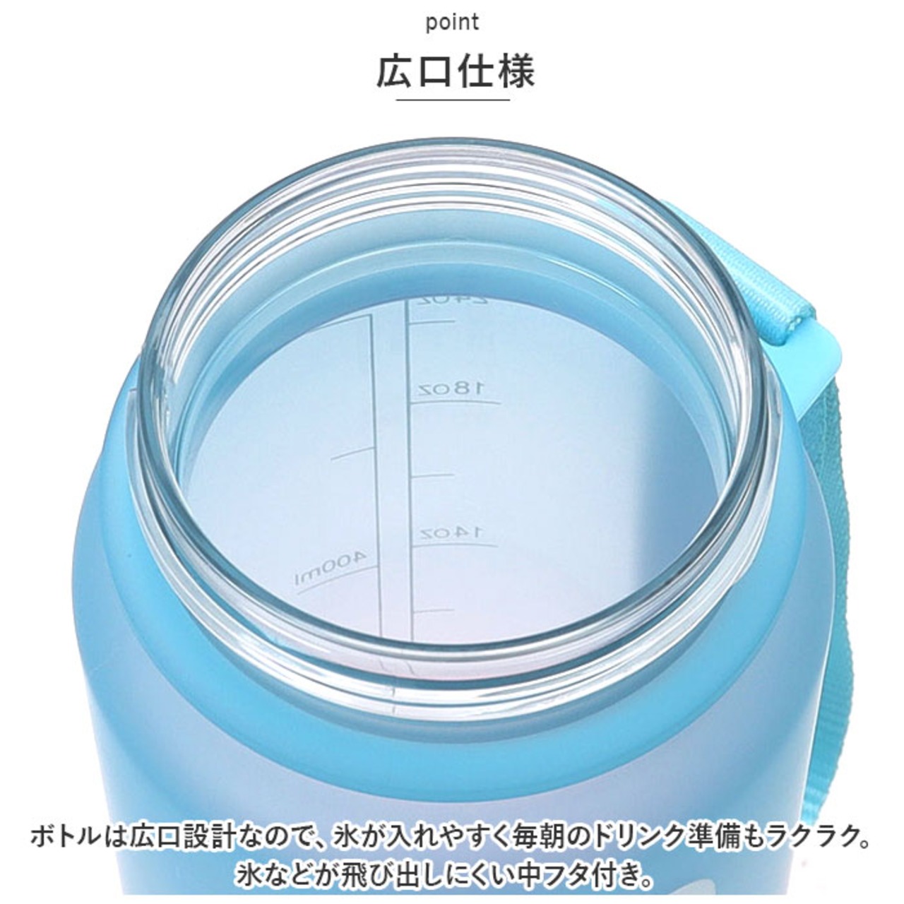 ・ボトルは広口設計なので、氷が入れやすく毎朝のドリンク準備もラクラク。氷などが飛び出しにくい中フタ付き。