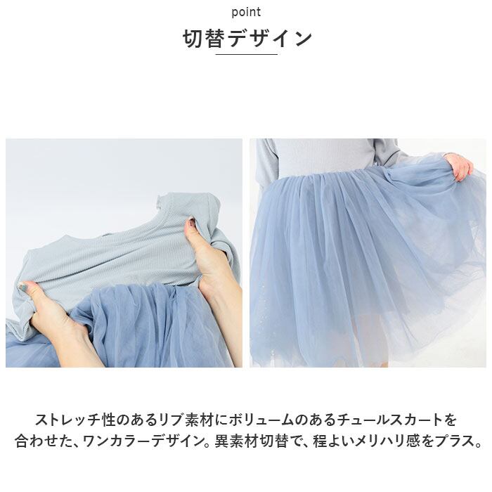 ・ストレッチ性のあるリブ素材にボリュームのあるチュールスカートを合わせた、ワンカラーデザイン。異素材切替で、程よいメリハリ感をプラス。