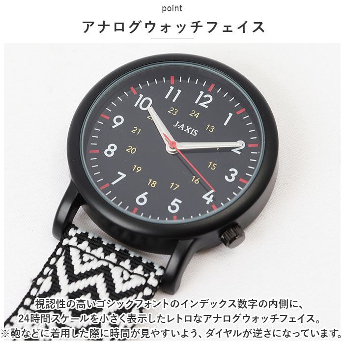 ・視認性の高いゴシックフォントのインデックス数字の内側に、24時間スケールを小さく表示したレトロなアナログウォッチフェイス。(※カバンなどに着用した際に時間が見やすいよう、ダイヤルが逆さになっています。)