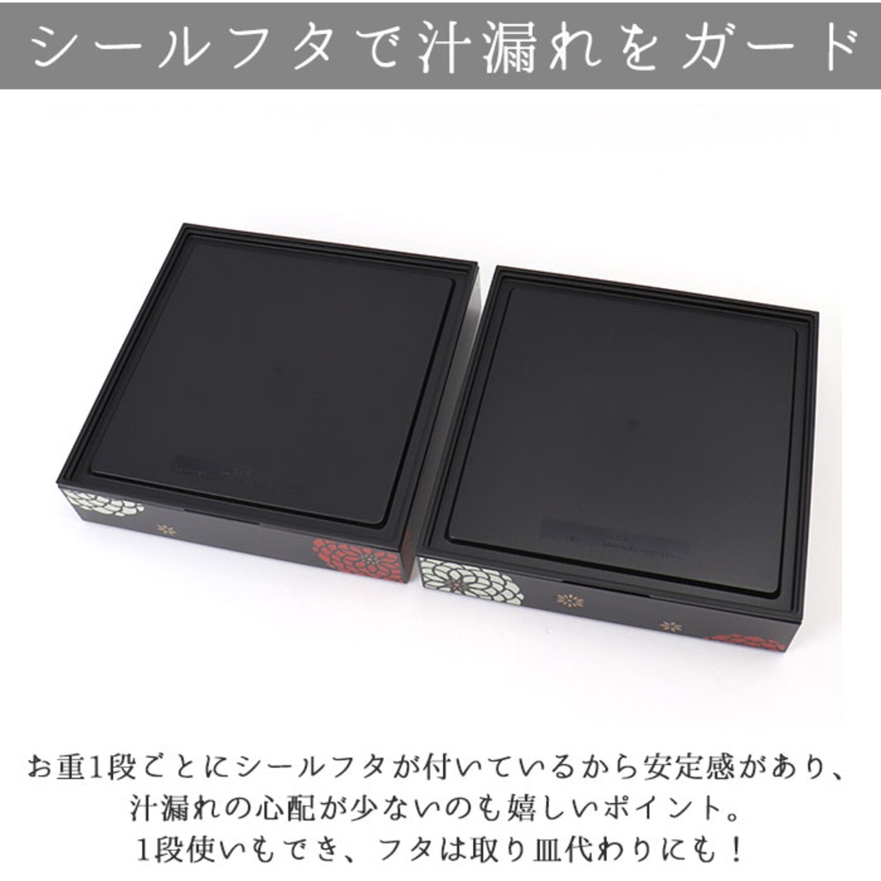 ・お重1段ごとにシールフタが付いているから安定感があり、汁漏れの心配が少ないのも嬉しいポイント。1段使いもでき、フタは取り皿代わりにも!