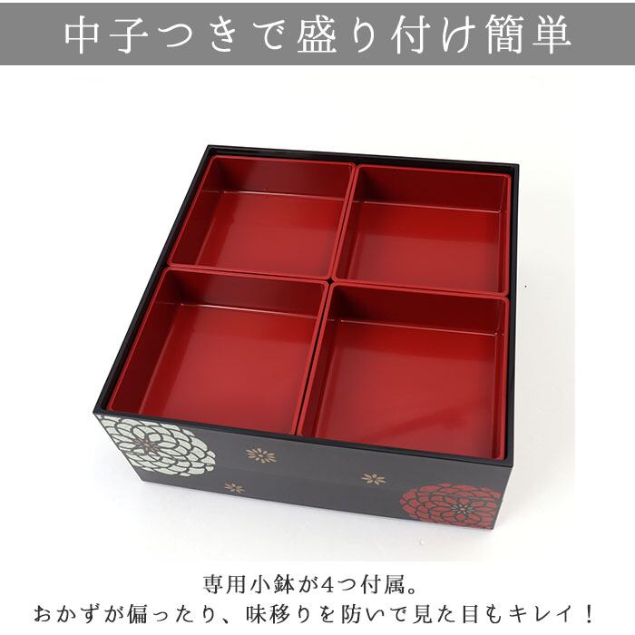 重箱 二段 通販 お重箱 2段 お重 オードブル重 おせち 22.5cm スクエア 正方形 仕切り小箱 4個 中蓋付き シールふた 日本製 和風 モダン お弁当箱 おしゃれ シンプル 4000ml 3人 4人 運動会 ピクニック 遠足 正月 迎春 行楽 花見