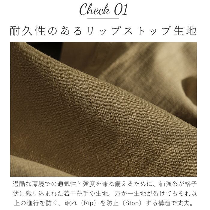 ・過酷な環境での通気性と強度を兼ね備えるために、補強糸が格子状に織り込まれた若干薄手の生地。万が一生地が裂けてもそれ以上の進行を防ぐ、