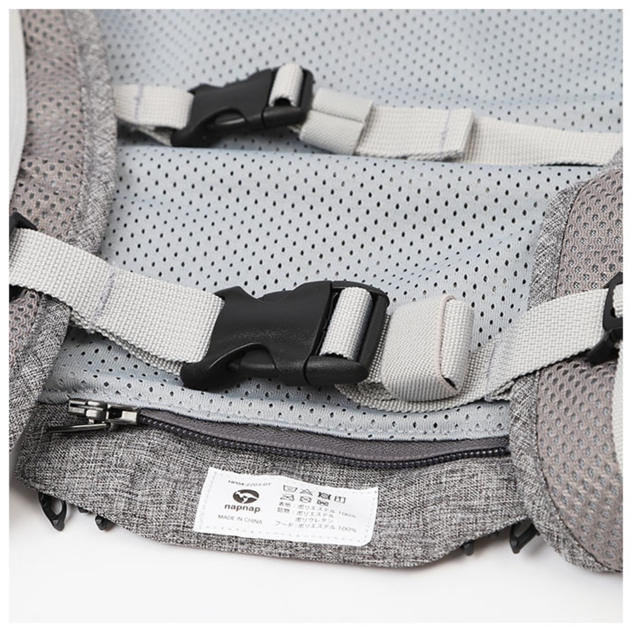 ・ショルダー表地は強度のあるメッシュ、裏地も肌触りのよい柔らかメッシュで仕上げ、ママパパにもサラッと優しい着け心地。