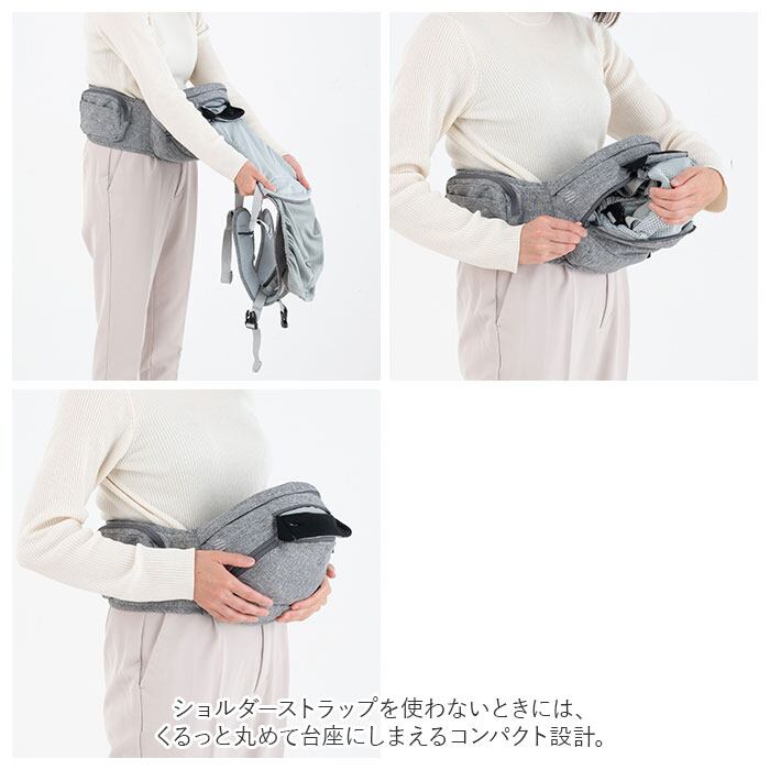 ・ショルダーストラップを使わないときには、くるっと丸めて台座にしまえるコンパクト設計。収納したままでもヒップシートとして使え、必要な時にサッと出して使えるので大きくなってきたお子さまにもピッタリ!