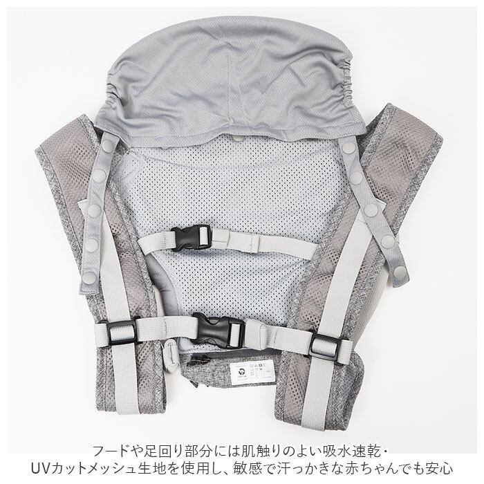 ・フードや足回り部分には肌触りのよい吸水速乾・UVカットメッシュ生地を使用し、敏感で汗っかきな赤ちゃんでも安心。