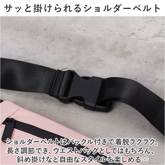 ・ショルダーベルトはバックル付きで着脱ラクラク。長さ調節でき、ウエストバッグとしてはもちろん、斜め掛けなど自由なスタイルを楽しめる◎