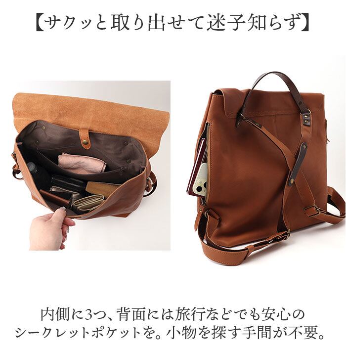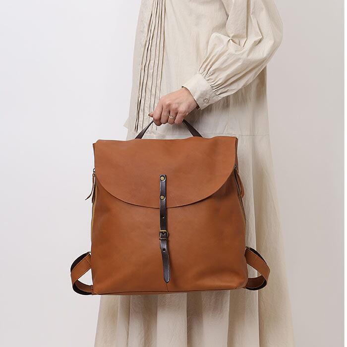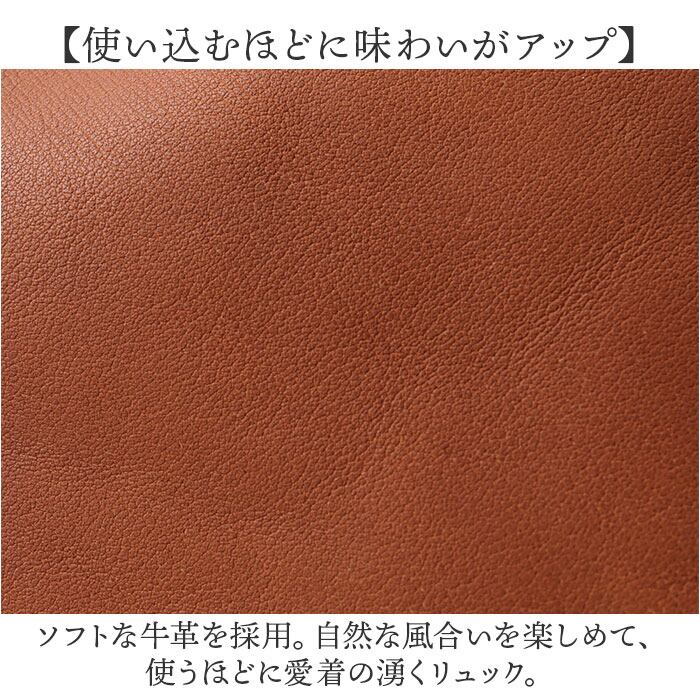 ・ソフトな牛革を採用。自然な風合いを楽しめて、使うほどに愛着の湧くリュック。