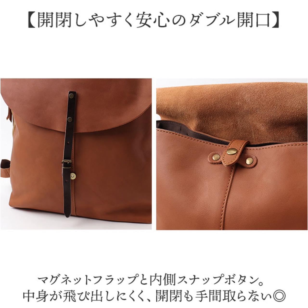 ・マグネットフラップと内側スナップボタン。中身が飛び出しにくく、開閉も手間取らない◎