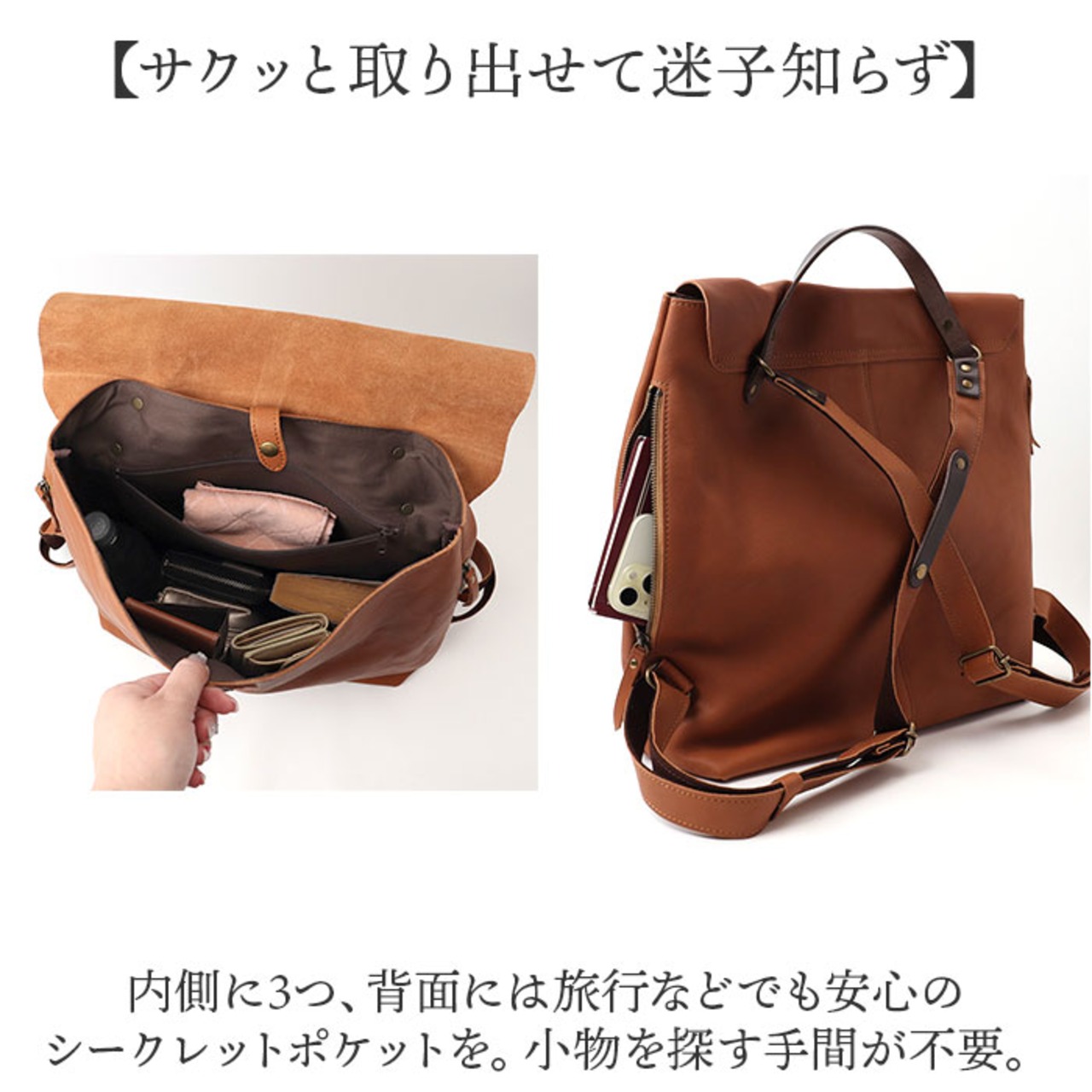 ・内側に3つ、背面には旅行などでも安心のシークレットポケットを。小物を探す手間が不要。