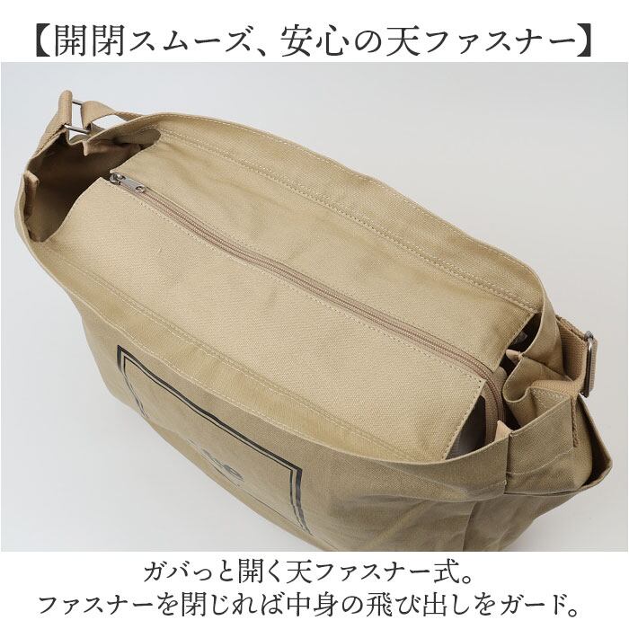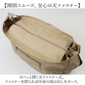 ・ガバっと開く天ファスナー式。ファスナーを閉じれば中身の飛び出しをガード。