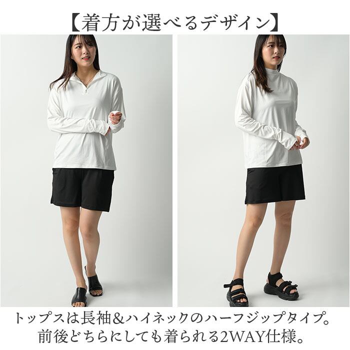 ・トップスは長袖&ハイネックのハーフジップタイプ。前後どちらにしても着られる2WAY仕様。