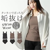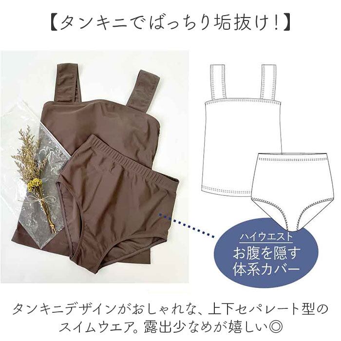 ・タンキニデザインがおしゃれな、上下セパレート型のスイムウエア。露出少なめが嬉しい◎