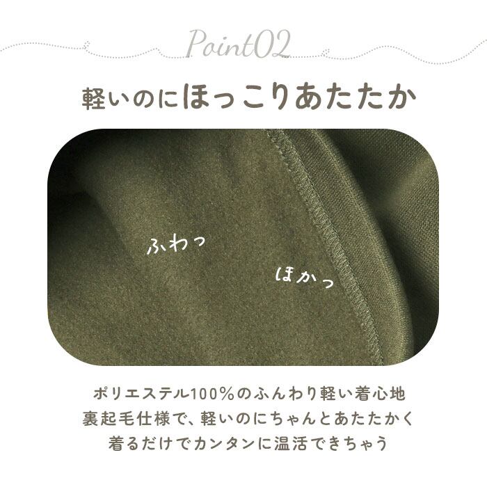 ・ポリエステルを100%したふわっと軽いスエット。上下とも裏起毛仕様なので、軽いのにちゃんとあたたかい。寒い季節も安心の作り。