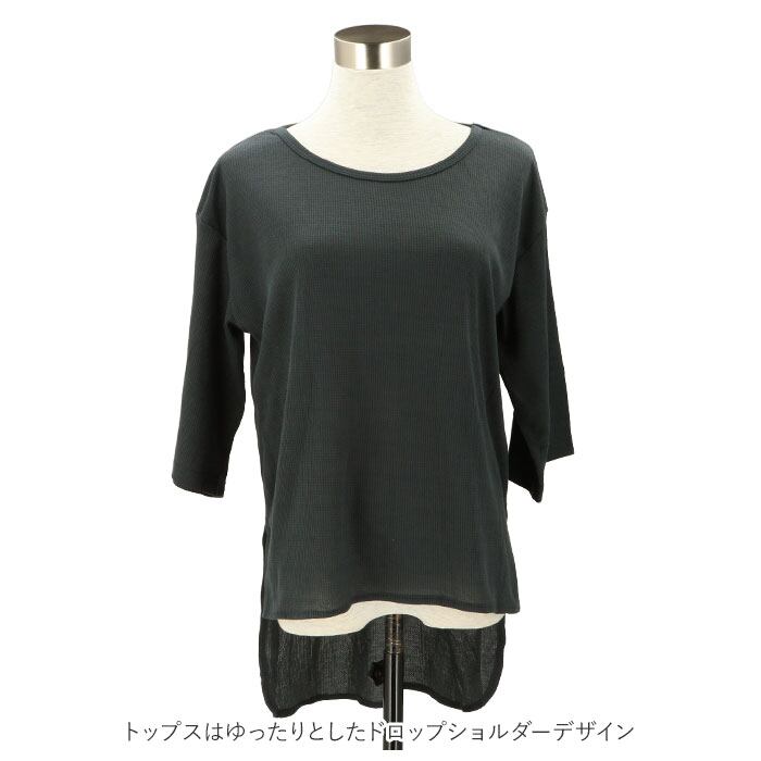 ・トップスはゆったりとしたドロップショルダーデザイン。前後で差をつけた丈感で、体型をふんわりとカバーしながら女性らしい印象を演出。
