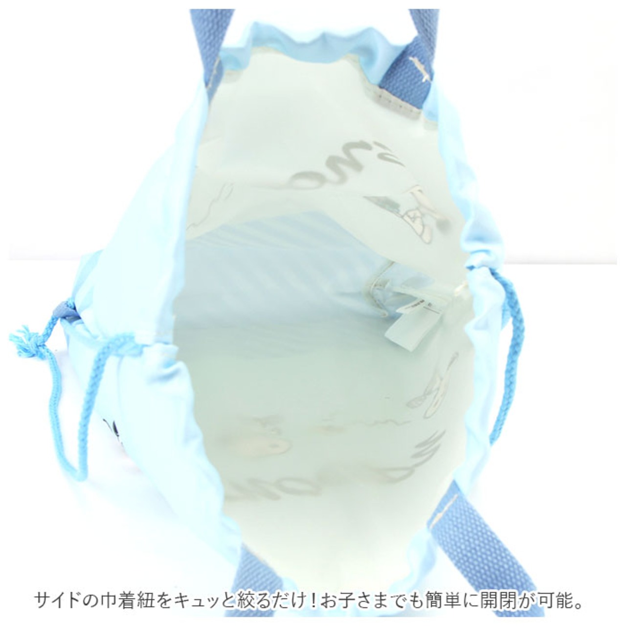 ・サイドの巾着紐をキュッと絞るだけ!お子さまでも簡単に開閉が可能。