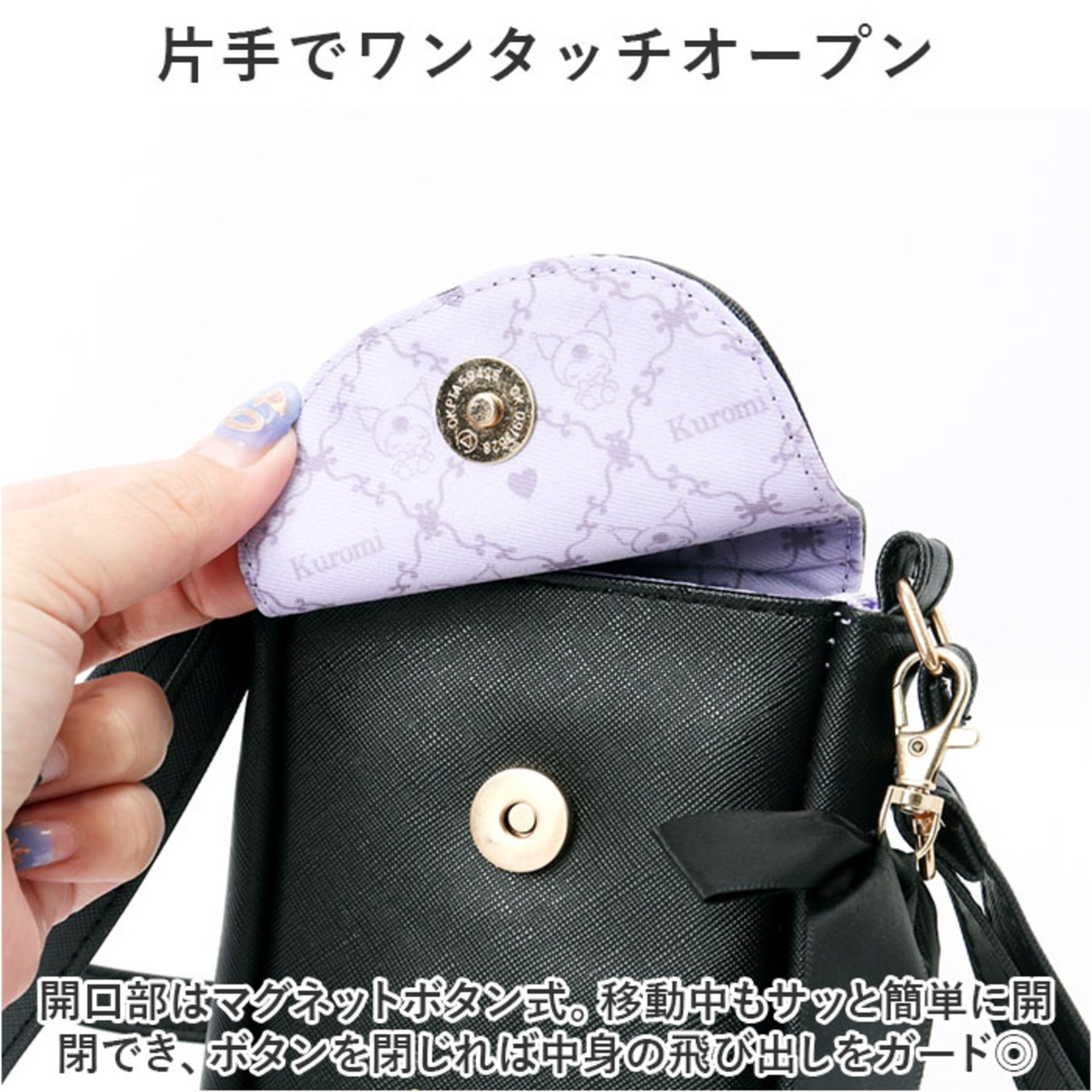 ・開口部はマグネットボタン式。移動中もサッと簡単に開閉でき、ボタンを閉じれば中身の飛び出しをガード◎