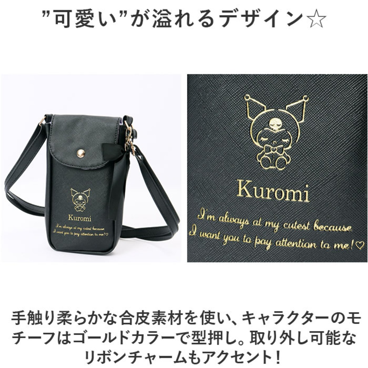 ・手触り柔らかな合皮素材を使い、キャラクターのモチーフはゴールドカラーで型押し。取り外し可能なリボンチャームもアクセント!