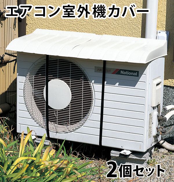 エアコン室外機用カバーの2点セット。夏は室外機にカバーするだけで日差しからガードし、冬は雪から室外機を守り、クーラーや暖房をより効果的にします。メーカーの遮熱性実験では約17度の温度差ができました☆簡単装着で、バンド(付属品)2本で取り付けるだけで風などに飛ばされる心配もありません。耐候性プラスチック使用。