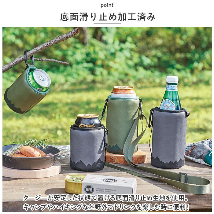 ・クージーが安定した状態で置ける底面滑り止め生地を使用。キャンプやハイキングなど野外でドリンクを楽しむ時に便利!