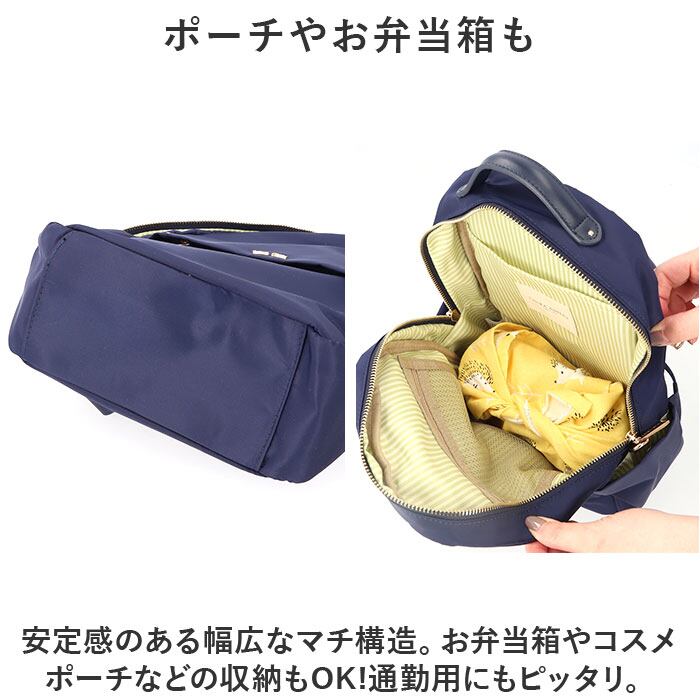 ・安定感のある幅広なマチ構造。お弁当箱やコスメポーチなどの収納もOK!通勤用にもピッタリ。