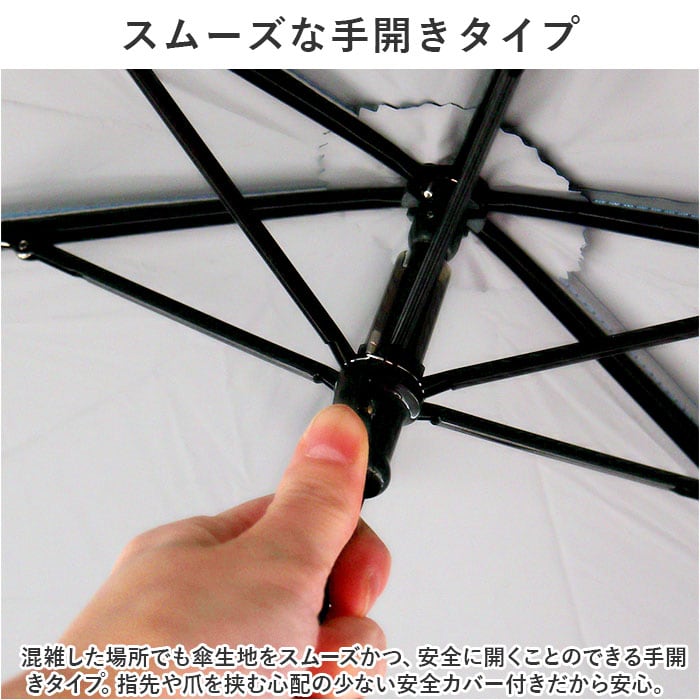 ・混雑した場所でも傘生地をスムーズかつ、安全に開くことのできる手開きタイプ。指先や爪を挟む心配の少ない安全カバー付きだから安心。