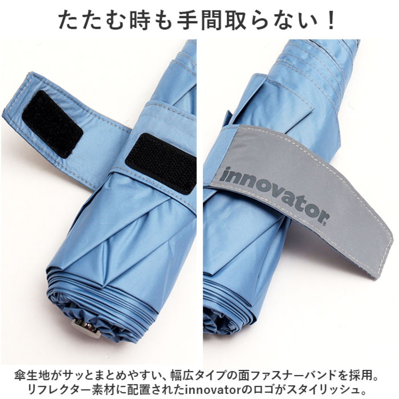 ・玄関に入るときに傘生地がサッとまとめやすい、幅広タイプの面ファスナーバンドを採用。リフレクター素材に配置されたinnovatorのロゴがスタイリッシュ。