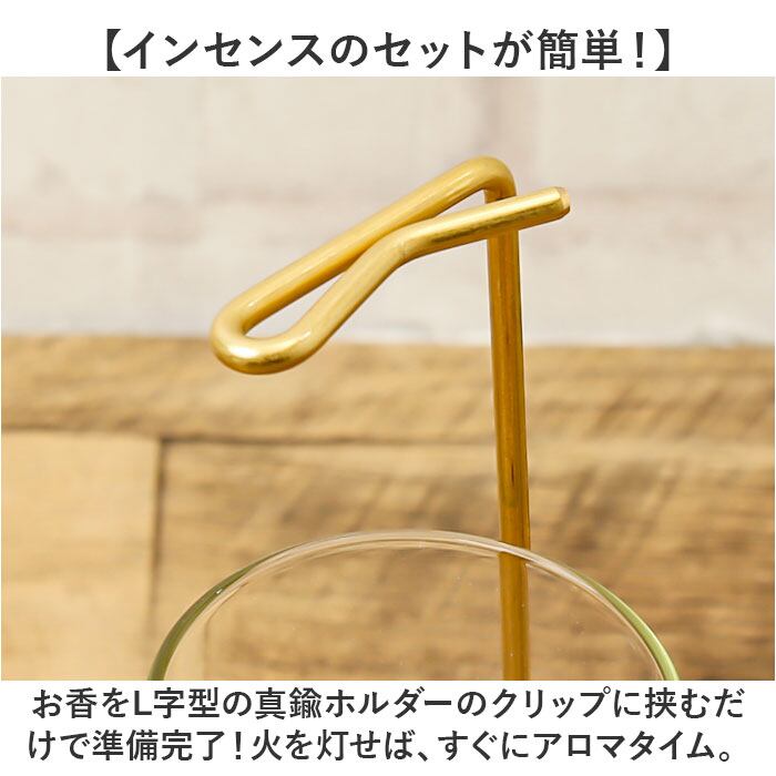 ・お香をL字型の真鍮ホルダーのクリップに挟むだけで準備完了!火を灯せば、すぐにアロマタイム。