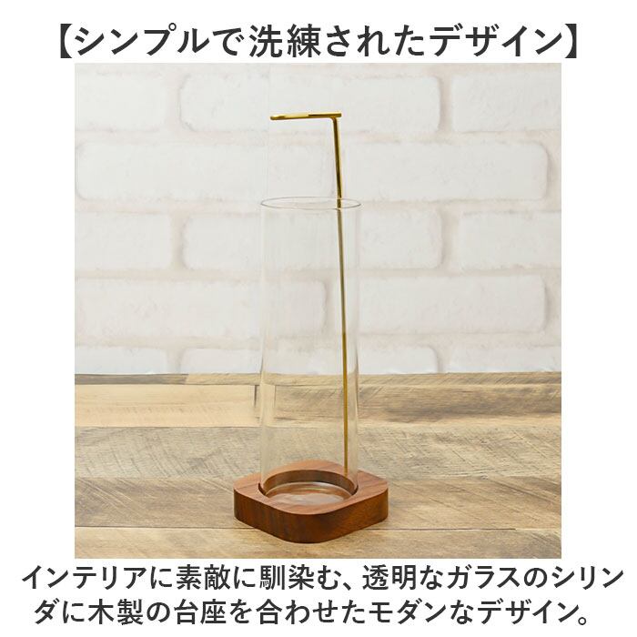 ・インテリアに素敵に馴染む、透明なガラスのシリンダに木製の台座を合わせたモダンなデザイン。