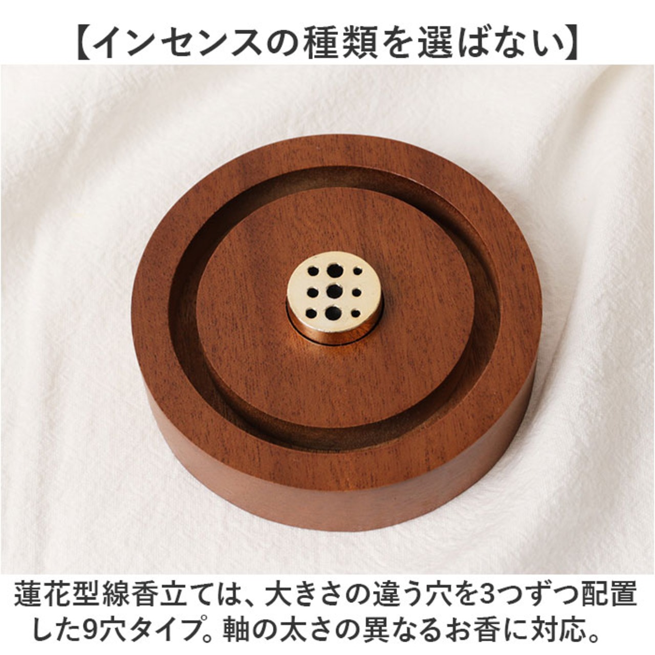 ・蓮花型線香立ては、大きさの違う穴を3つずつ配置した9穴タイプ。軸の太さの異なるお香に対応。