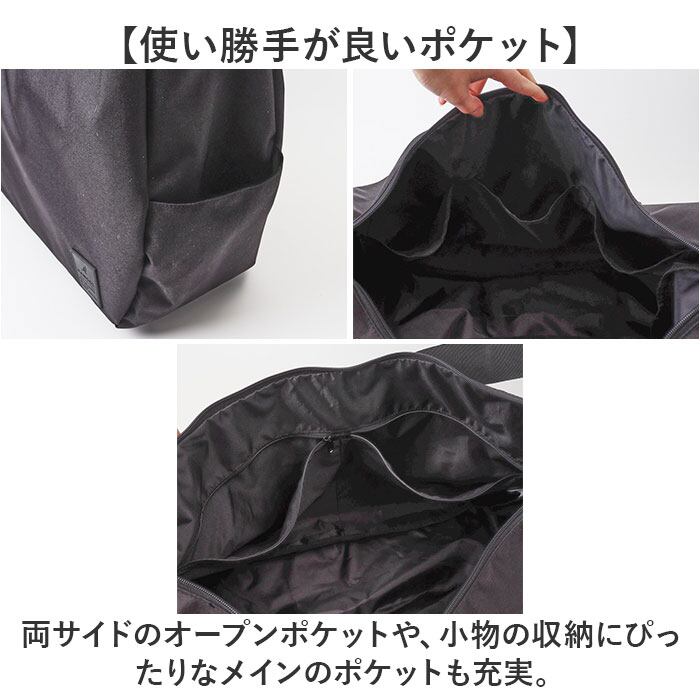 ・両サイドのオープンポケットや、小物の収納にぴったりなメインのポケットも充実。