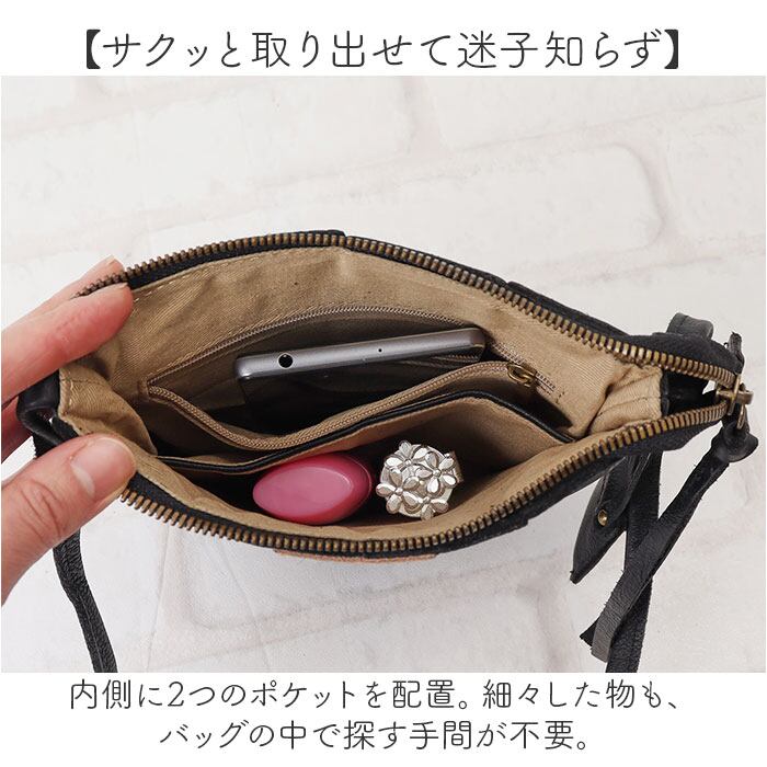 ・かさばらないスリム設計。ミニ財布や薄手のハンカチ、スマホなどをIN。