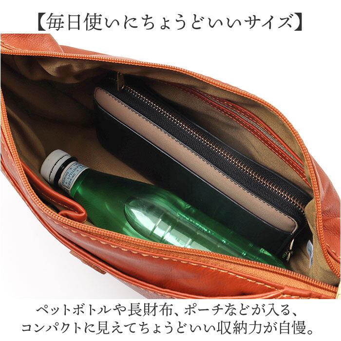 ・ペットボトルや長財布、ポーチなどが入る、コンパクトに見えてちょうどいい収納力が自慢。