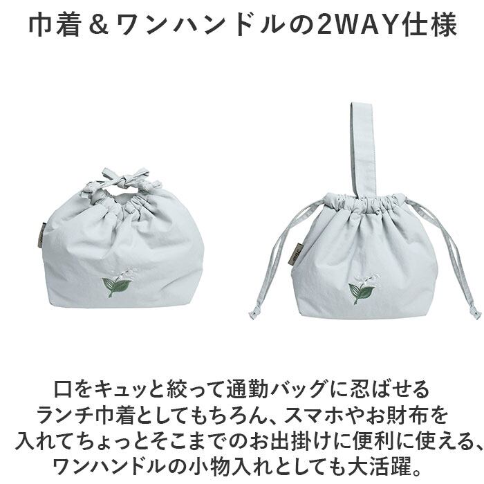 ・口をキュッと絞って通勤バッグに忍ばせるランチ巾着としてもちろん、スマホやお財布を入れてちょっとそこまでのお出掛けに便利に使える、ワンハンドルの小物入れとしても大活躍。