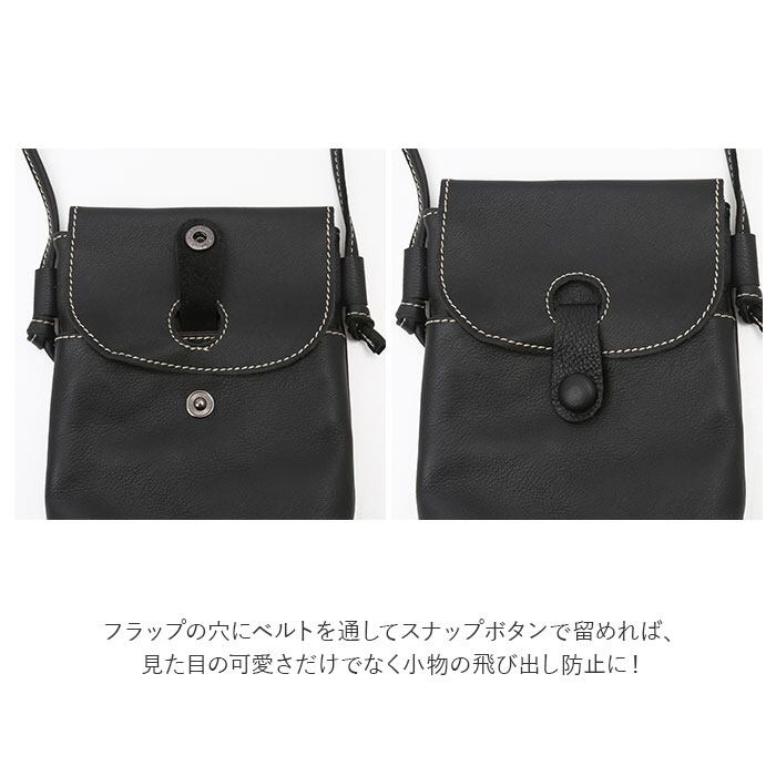 ・フラップの穴にベルトを通してスナップボタンで留めれば、見た目の可愛さだけでなく小物の飛び出し防止に!