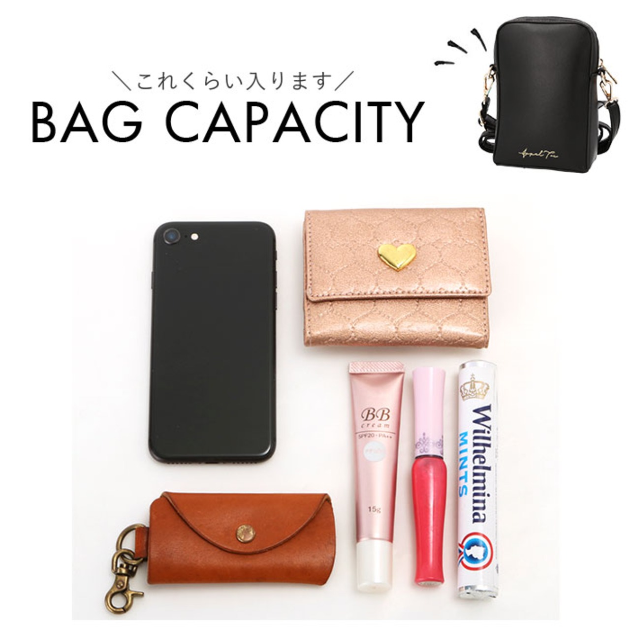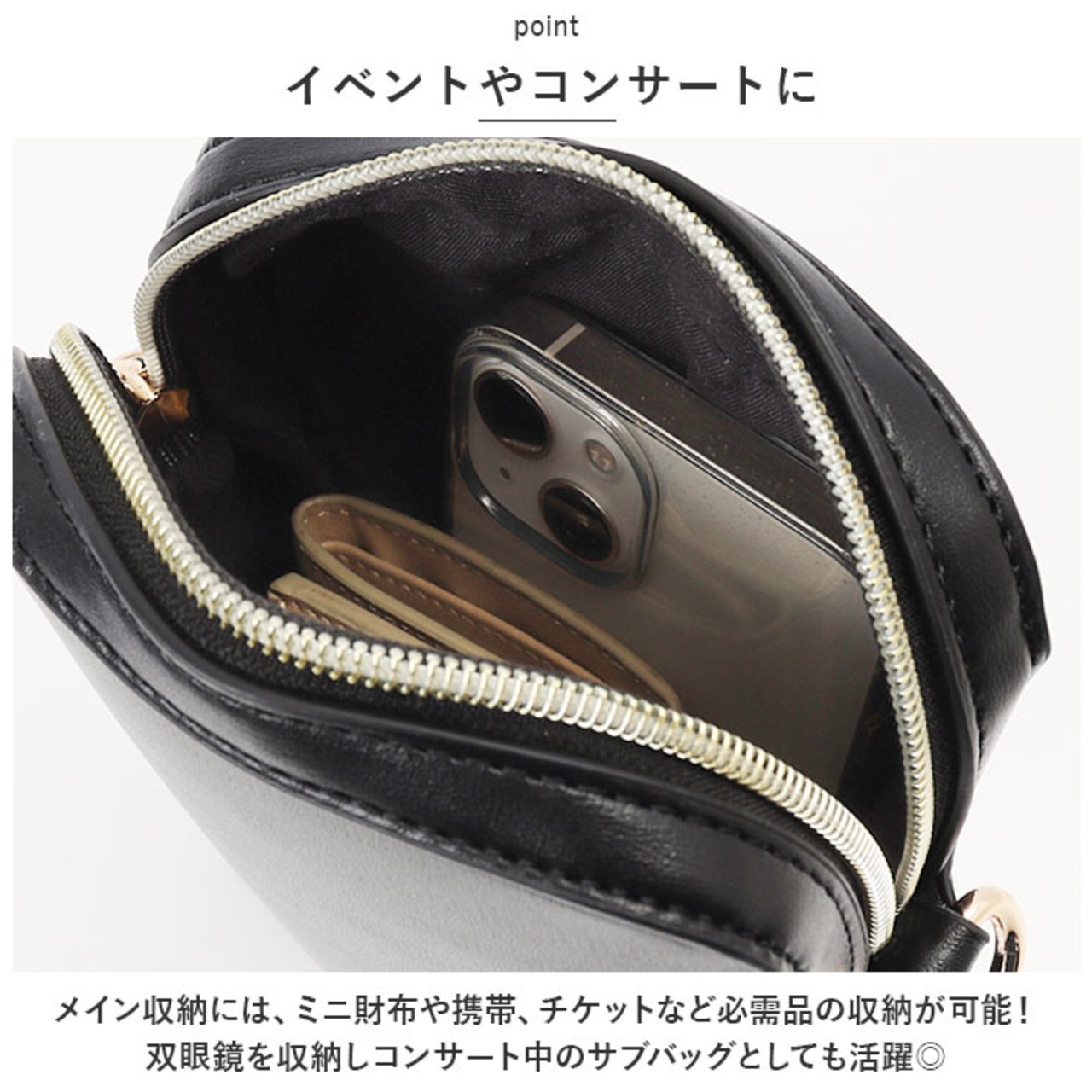 ・メイン収納には、ミニ財布や携帯、チケットなど必需品の収納が可能!双眼鏡を収納しコンサート中のサブバッグとしても活躍◎